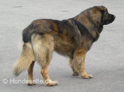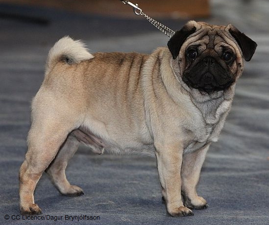 Der Mops ist Beispiel einer kurzhaarigen Rasse für dieses Allel, er trägt zudem eine Maske. Die gebänderten Haare lassen sich vor allem auf dem Rücken ausmachen, wo die Haare etwas länger sind.