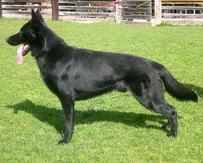 Rezessives schwarz ist verantwortlich für ein einfarbig schwarzes Fell (sofern keine weissen Abzeichen vorhanden). Es ist relativ selten, kommt jedoch in einigen Rassen vor, z.B. Deutscher Schäferhund, Puli oder Australian Shepherd.