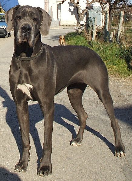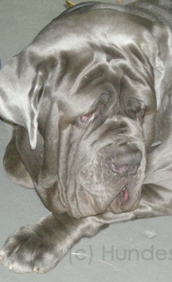 Beim Weimaraner, beim Whippet und dem Mastino ist die verdünnte Farbe sofort sichtbar, da sie einfarbig sind. Bei der Antikdogge muss man genauer hinsehen. Hier sieht man die verdünnte Farbe nur an seiner dunklen Maske und seiner Nase. Sie ist nicht schwarz, sondern blau-grau. Die hellere Farbe des Wemaraners ist die Aufhellung von brauner Grundfarbe.