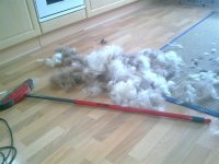 Ich hab bis vor 2 Jahren eine Bernhardiner-Hündin gehabt, da hab ich mal ein Foto gemacht, wieviel Fell ich da TÄGLICH während des Fellwechsels rausgeholt habe...