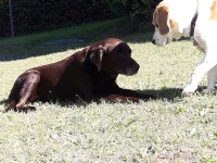 Jetzt zum Foto. Mein Labi hat die Nähe zum Beagle gemieden. Aus welchem Gründen auch immer. Hier lag er gerade in der Sonne und der Beagle ging geradewegs auf ihn zu. Mäx nimmt dann die Ohren zurück, das Gesicht sieht besorgt aus und der Kopf geht runter.