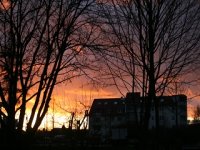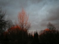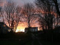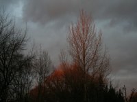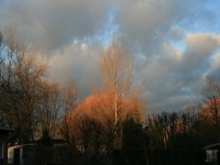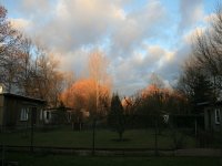 Heute 16 Uhr in Le. Etwas Wind bei 6 Grad, Baumkronen leuchten in der untergehenden Sonne.