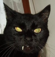 Der Zahn ist echt. Er hatte auch mal zwei, aber dann mussten sie leider nacheinander wegoperiert werden. Warum die bei ihm noch weit rausstanden? Bei einer Zahnsteinbehandlung stellte mal ein TA fest, dass er einen schiefen Kiefer hat. Wohl durch einen Unfall. Das war ich platt, denn ich hab den Dicken seit er fünf Wochen alt war. Ich kann mich an einen Tag erinnern, an dem er mit blutiger Schnauze nach Hause kam. Aber die TÄ damals hat nur die Fleischwunde genäht, von einer Kieferfehlstellung hatte sie nichts gesagt.