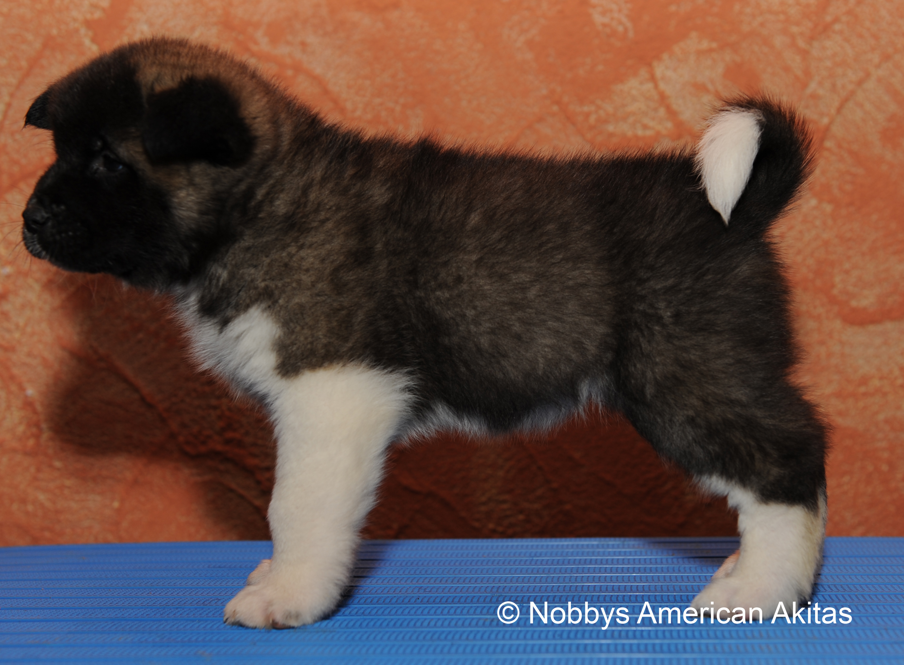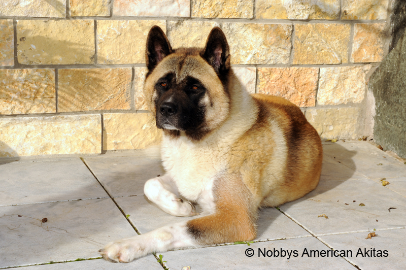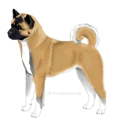 Alle Farben sind beim American Akita erlaubt. Häufige Fellfarben sind braun, rot, falb, weiß und schwarz, auch gescheckte oder gestromte Varianten kommen vor. Charakteristisch für den American Akita ist die Maske im Gesicht, die oft dunkel oder sogar schwarz ausfällt, was sein markantes Erscheinungsbild unterstreicht.